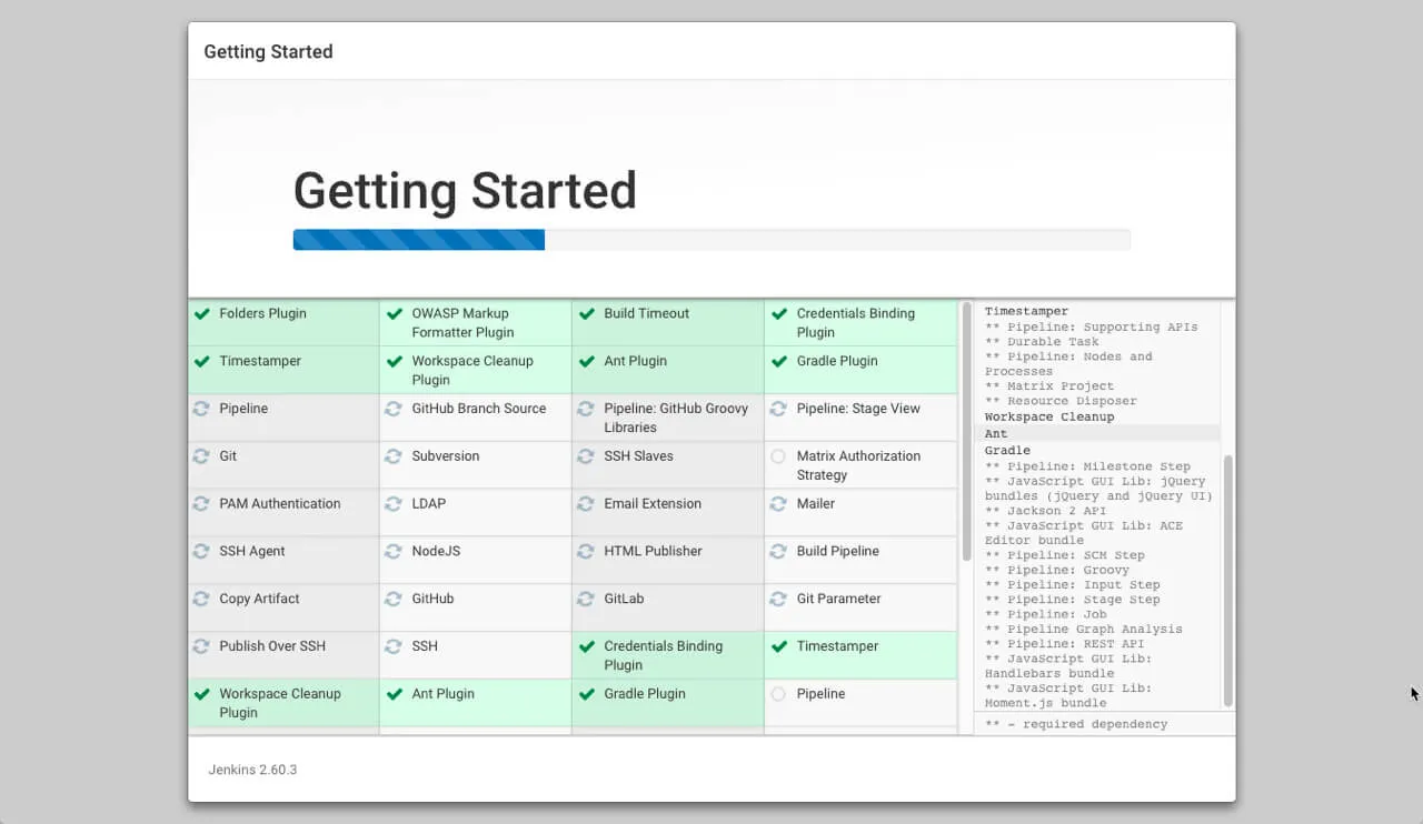 cat /var/jenkins_home/secrets/initialAdminPassword这时候回得到一串密码,复制后粘贴到刚刚Jenkins的页面,点击Continue进入插件安装页面,这里根据个人喜好选择安装默认插件还是自己选择: